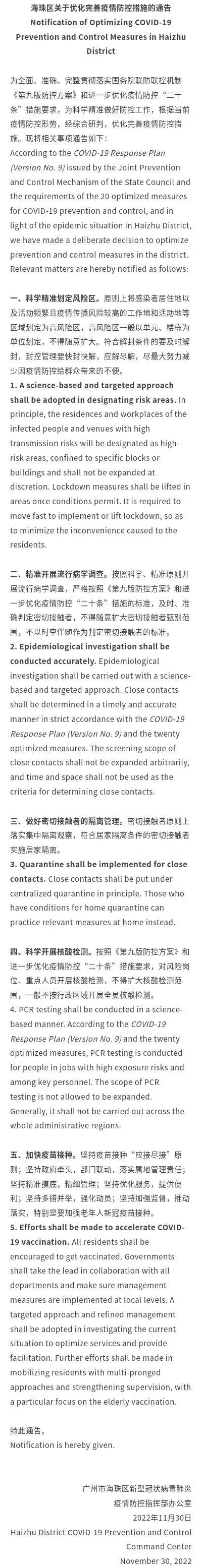 On November 30, 11 districts in Guangzhou issued notices to optimize COVID-19 prevention and control measures, which announces to lift all the restriction in the temporary lockdown areas. It means Guangzhou is moving into a new phase of regular prevention and control measures so as to minimize the inconvenienced caused to the residents.