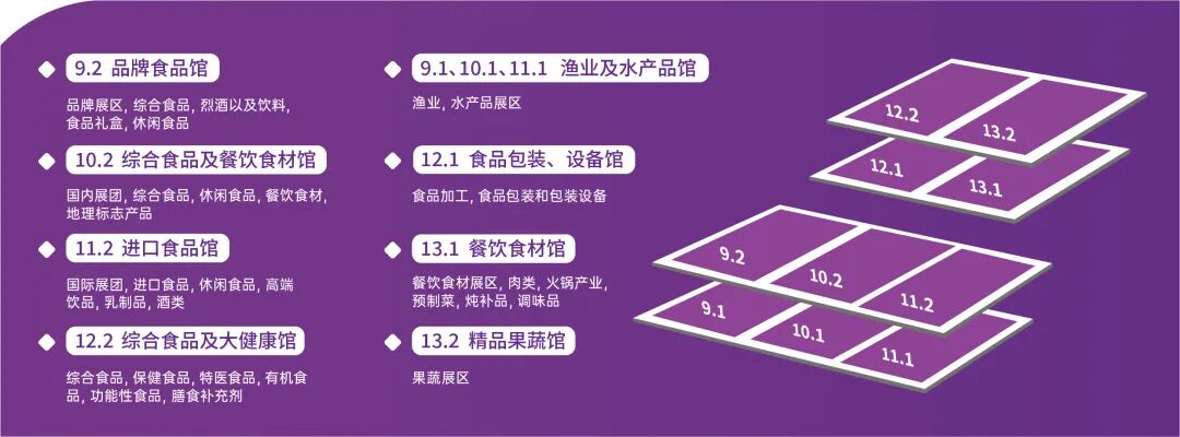 品牌食品馆、综合食品及餐饮食材馆、进口食品馆、精品果蔬馆、大健康食品馆、渔业及水产品馆、食品包装设备馆等10大展馆