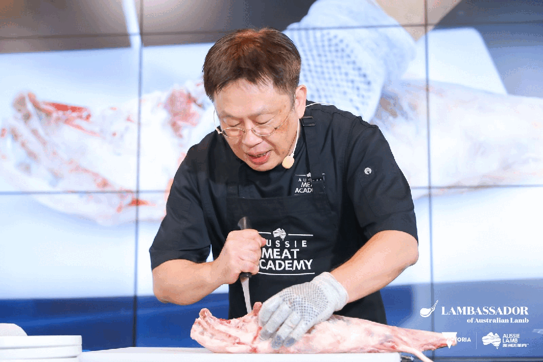 活动中,澳洲牛羊肉资深技术专家Calvin Gung展开了深度演示,现场分切了澳洲羔羊腿。他不仅对澳洲羔羊不同部位的肉质分割进行了详尽解析,还逐一展示了包括澳洲羔羊肋排(羊腹排)、澳洲羔羊膝(羔羊前腱)在内的多种精细分切产品,使现场观众更直观地了解了各部位肉的切割方法及其实际应用。