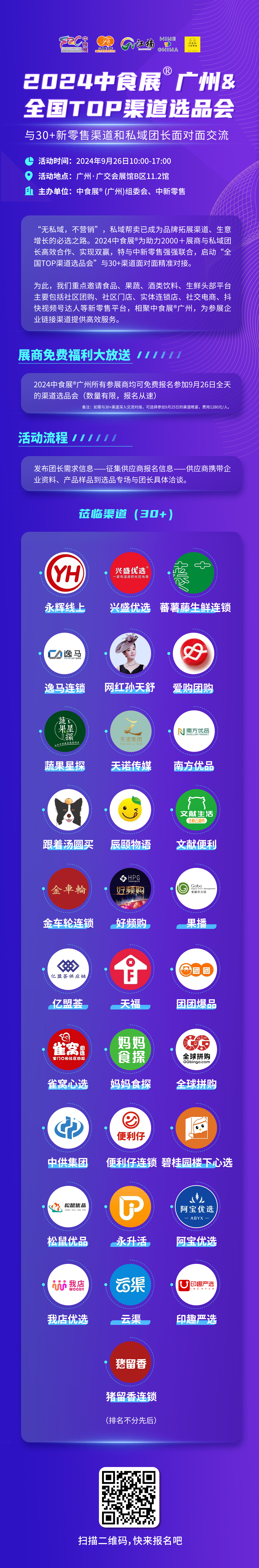 随着行业迎来多元化的生态渠道,为助力企业高效对接新兴渠道、掌握新颖营销策略、融入高端商业圈层、探索新的增长点,中食展®广州组委会携手中新零售举办“中食展®广州&全国TOP渠道选品会”,本场选品会重点邀请食品、果蔬、酒类饮料、生鲜头部平台主要包括社区团购、社区门店、实体连锁店、社交电商、抖快视频号达人等新零售平台,助力新渠道买家及展商实现高效对接。