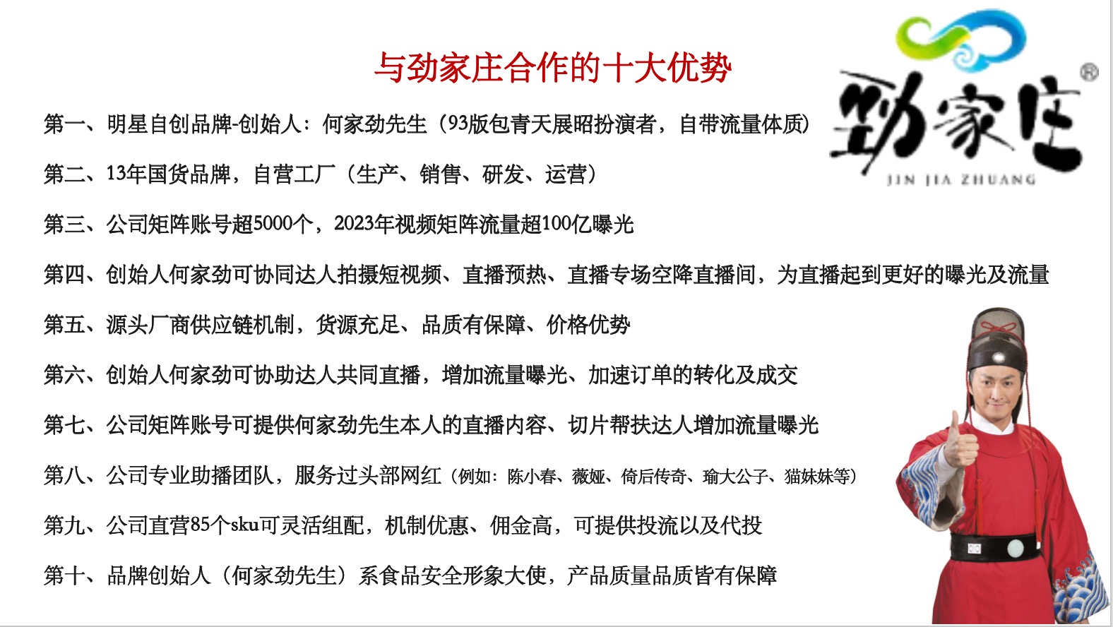创始人是知名影星何家劲(劲家庄食品健康有限公司),工厂荣获国家3A景区,北京供冬奥会食品生产商,杭州供亚运会食品生产商。劲家庄自营品牌的产品在抖音,天猫销售额单月三千万,一年三个亿。系列产品荣获惠州手信50强。