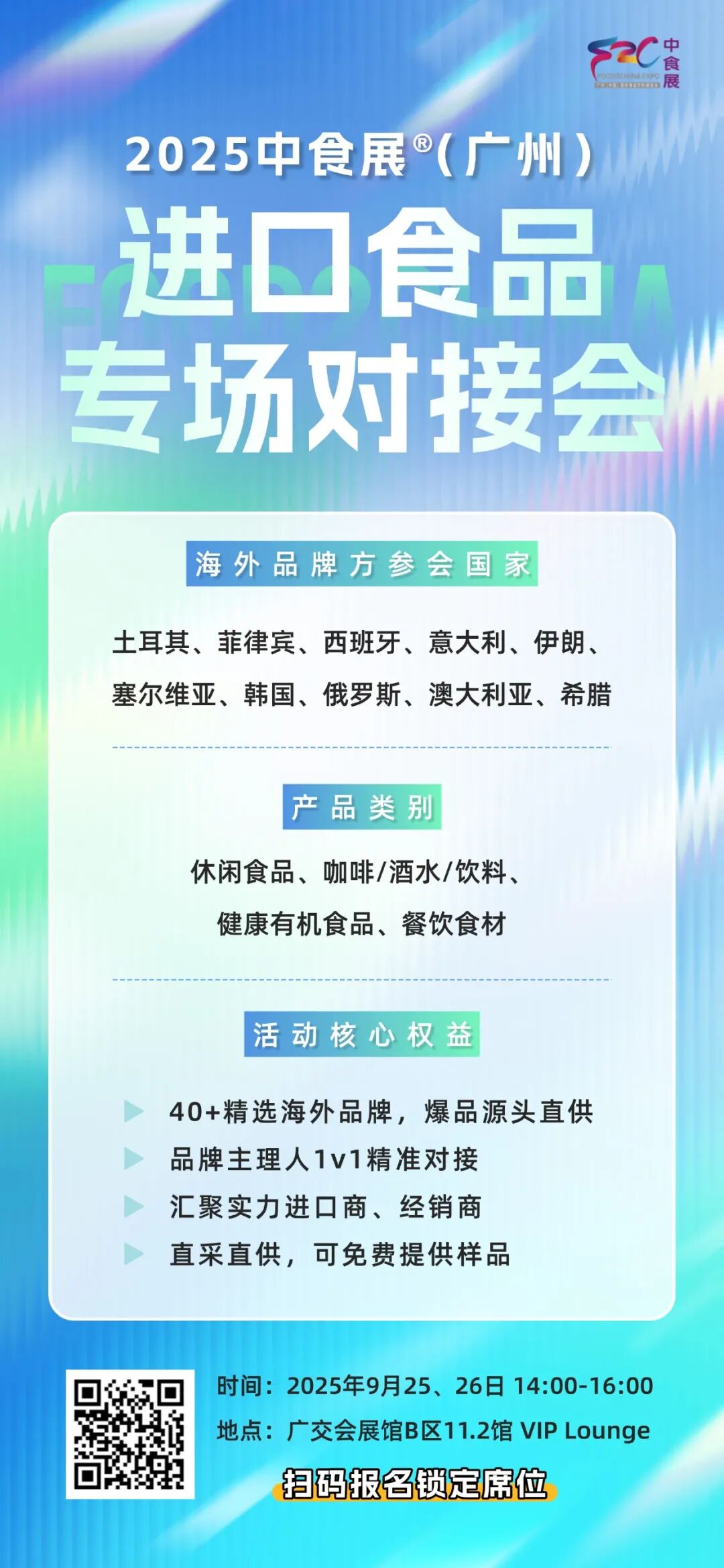 9月25-27日,2025中食展®广州将于广州广交会展馆B区举办。本届展会展览将吸引来自40+国家及地方展团,近1000家食饮企业参展,汇聚全球食品行业最新产品,展览范围涵盖休闲食品、进口食品、精品果蔬、地方特色产品、酒类、高端饮品、餐饮食材等多个板块。