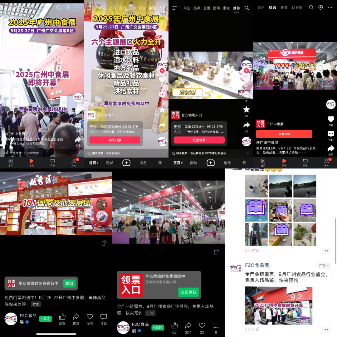 线上是触达专业买家的关键入口,本届F2C中食展®(广州)以“垂直平台+行业媒体+百度搜索+抖音+朋友圈”五维推广矩阵为核心,精准触达专业买家:抖音端围绕“9.25-27广交会展馆”打造展商剧透、免费领票等定制短视频,按地域、行业标签、兴趣定向投流,植入免费领票弹窗;朋友圈则基于微信画像推送分层图文,针对经销商、餐饮采购商等群体匹配专属内容,推送定制化展会信息;