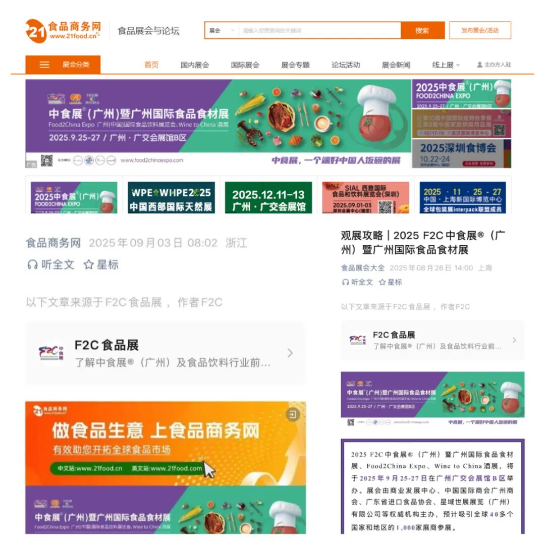2025F2C中食展®(广州)暨广州国际食品食材展、Food2China Expo、Wine to China Fair,将于2025年9月25-27日在广州广交会展馆B区盛大启幕。为筑牢展商商贸价值,主办方将“专业观众精准邀约”作为核心目标,通过线上全域渗透、线下定向攻坚、资源联动赋能三维度发力,打造华南食品行业专业买家集结盛宴。
