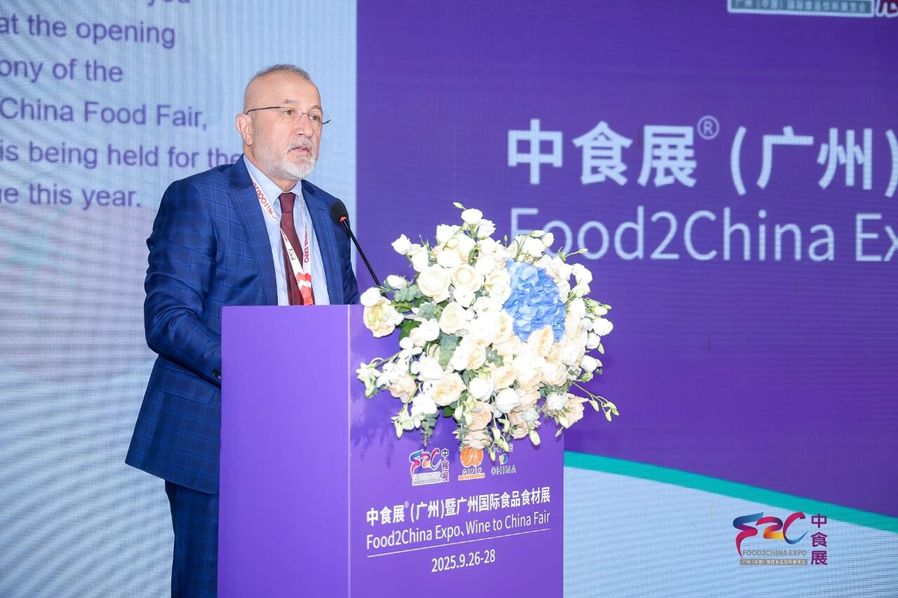 土耳其伊斯坦布尔商会副会长Ahmet ÖZER代表境外商协会发言,他对中食展®(广州)的平台价值给予高度认可。他介绍道,伊斯坦布尔商会自1882年起便一直引领土耳其的商业发展,目前拥有80余万名会员,是全球第二大商会;在国际合作布局中,中国始终是该商会优先深耕的重要伙伴。