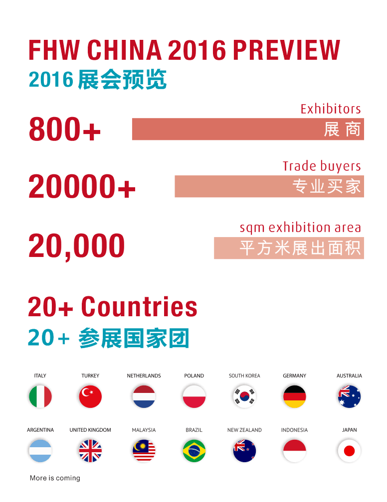 时间:2016年9月22日-24日 地点:中国(广州)进出口商品交易会展览馆C区 特点:B2B专业进口食品馆(仅对专业观众开放) FHW CHINA由意大利米兰展览公司及其中国公司—广州世展米兰展览有限公司, 联合广东省贸促会主办,至今已成功举办数年。作为首个落户华南地区的B2B食品展会,无论是国际性还是专业性,FHW CHINA可以说是占据了绝对领先优势。