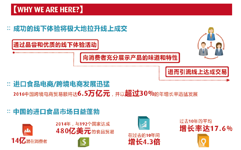 中国食品电商/跨境电商发展迅猛 2016年中国跨境电商进出口贸易额将达6.5万亿元,未来几年比例将提高到20%,年增长率超过30%。 成功的线下体验将极大地拉升线上成交 消费者往往对食品的体验感要求很高,仅仅通过看图片还不足以展示整个产品的特点,味道,因此需要优质的线下体验活动,通过品尝、试吃等行为,进而达到引流线上,促进成交的目的。