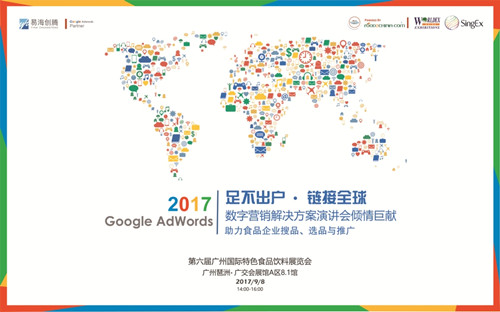 9月8日14:00-16:00, 广州广交会展馆A区8.1馆,FHW CHINA 2017 | POWERED BY FOODTOCHINA.COM 联合广州易海创腾信息科技有限公司,举办“足不出户·链接全球——数字营销解决方案演讲会”全面助力食品企业利用Google助力企业搜品、选品与推广。