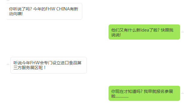 FHW CHINA 一直专注于进口食品领域,致力让更多优质进口食品进入中国市场。为了进一步打通从上游生产商到下游终端销售,第三方服务商,今年FHW CHINA 决定设立进口食品第三方服务展区,为这些进口食品供应链上的中坚力量提供展示自己最强实力的舞台,丰富展会内容,让进口食品企业和第三方服务企业在行业高速发展的路上实现双赢!