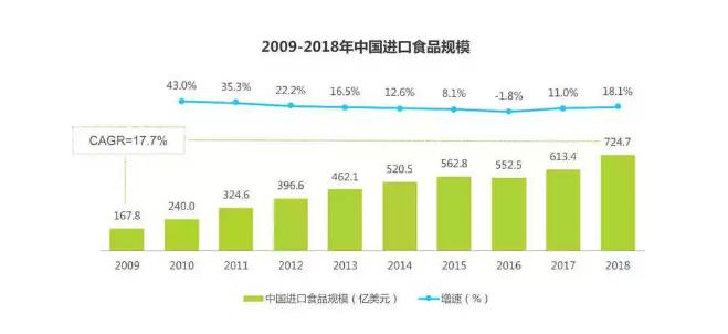 根据艾瑞咨询《2019年中国进口食品消费白皮书》,2009-2018年十年间,进口食品规模以17.7%的复合增长率高速增长,2018年首次超过700亿美元。得益于中国经济的快速发展,国民生活水平的不断提升,开放政策的支持以及贸易便利化措施的不断完善,进口食品已经逐渐成为寻常百姓餐桌的重要组成部分。