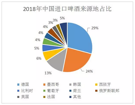 进口啤酒搭上了消费升级的风口,符合现在现在消费者的个性化需求,因此进口量不断增长。那么,中国人更爱喝哪个国家的啤酒呢?根据统计,2018年中国主要进口啤酒来源地区是欧洲,像德国、西班牙、比利时等国家。德国啤酒在中国真的非常受青睐,2018年中国从德国进口啤酒将近2.4亿升,超过全年进口量的25%,名列第一;墨西哥紧跟其后,将近2亿升;而中国从韩国进口啤酒也超过了1亿升,这三个国家的进口量已经接近中国全年啤酒进口量的2/3。