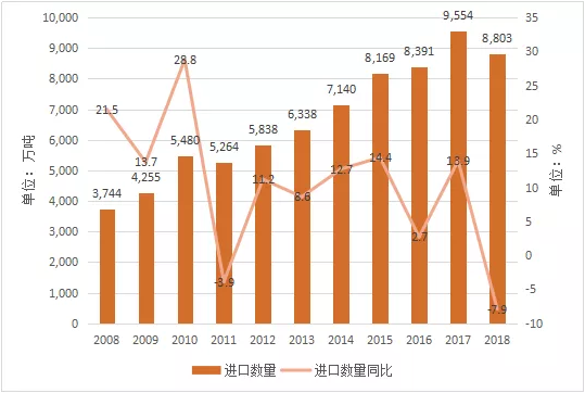 2008-2018年中国大豆进口数量及同比统计表