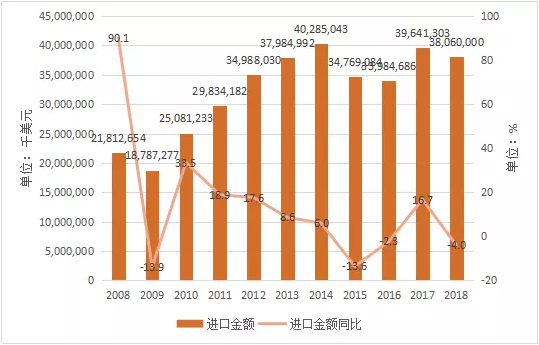 2008-2018年中国大豆进口金额及同比统计表