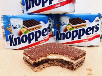 Knoppers威化饼,低糖低脂低卡路里,每包只有132卡路里喔!5层食材:费列罗巧克力+鲜牛奶层+威化饼+榛仁巧克力酱+威化饼,丰富的口感,分分钟干掉一块!Knoppers在近两年来堪称零食界的明星,经常刚上货架就被抢空,嘴馋时想吃一块还得看运气呢!