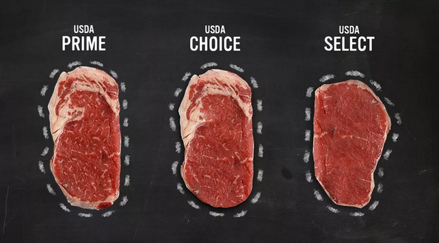 根据这两项指标,牛肉被分成八类:Prime(极佳级)、Choice(特选级)、Select(上选级)、Standard(标准级) 、Commercial(商业级)、Utility(实用级)、Cutter(切割级)和Canner(制罐级) ,前五个等级消费者能够直接购买,最后三级多用于制作加工食品。