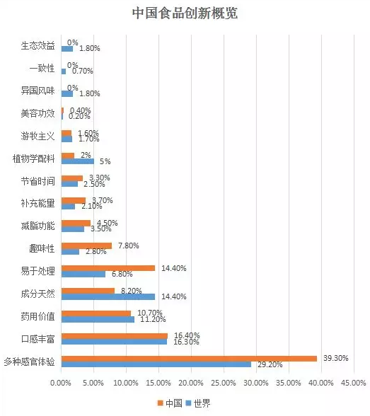 对于吃,全球的吃货似乎都有一个共识,就是要吃得开心。根据报告,为了让消费者的多种感官都能体验到喜悦,全球各个国家创新食品中,50.2%的创新食品都主张消费者的愉悦体验。在中国,这个比例高达60.2%,全球最高。多种感官体验,比如新的口味和口感,依然是最主要的趋势,对口感丰富的追求也依然势头强劲。