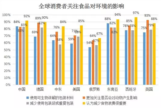 由于人类的行为对环境造成的影响日益扩大,越来越多消费者也会考虑食品对于环境的影响。超过83%的中国消费者都表示会关注食品是否使用可生物降解的包装材料、是否对动物产生影响以及减少使用包装袋或重复包装,而92%的中国消费者会认为减少食物浪费很重要。