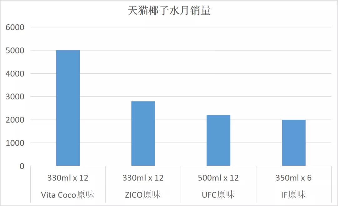 天猫超市的数据显示,VITA COCO是卖得最好的椰子水品牌,一箱330ml(12盒) 的月销量接近5000笔。其它相对热销的品牌是可口可乐旗下的ZICO椰子水和来自泰国的UFC,ZICO一箱330ml(12盒)的月销量约2800,而UFC一箱500ml(12盒)的月销量也有2200多。
