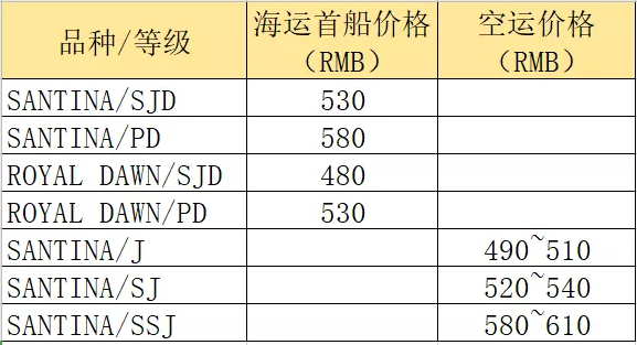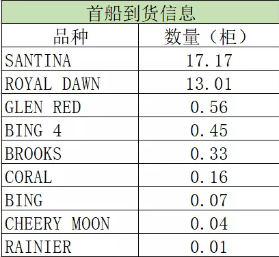 近日,F2C收到了广州江南市场喜提首船智利车厘子的消息。据悉,这一船共有31.8柜抵达香港,其中,SANTINA品种有17柜,ROYAL AWN品种有13柜。(其余品种详见表格)
